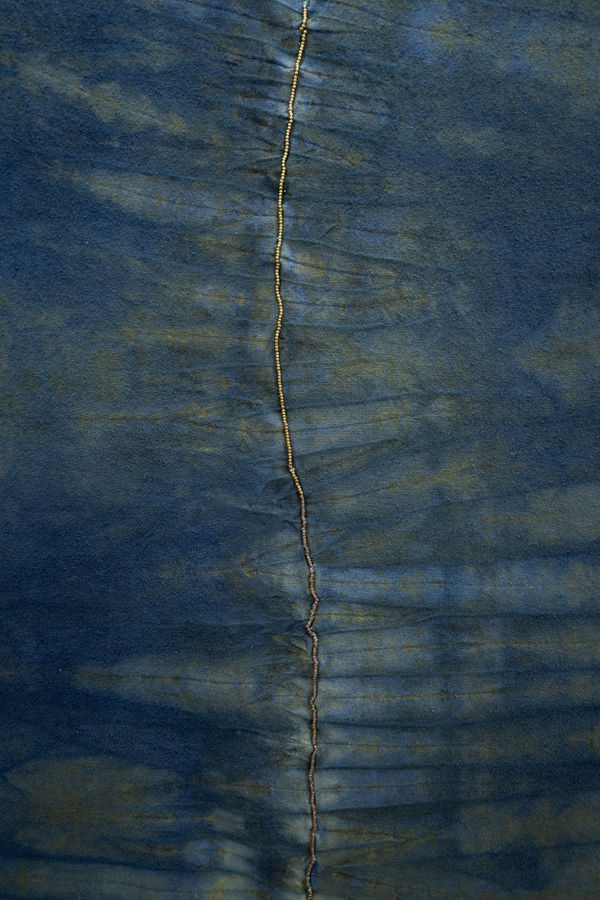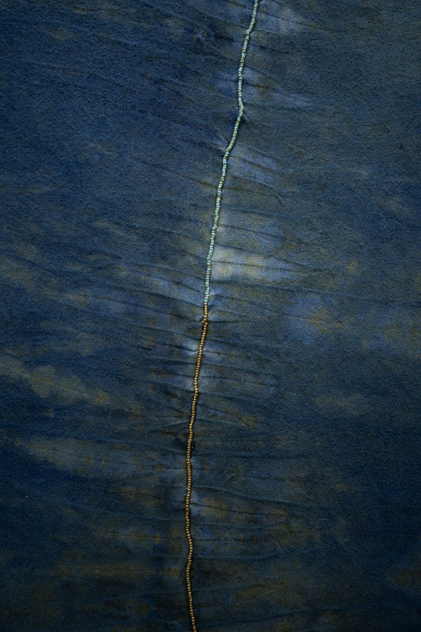 Mbete’s new works deepen her exploration of textile as archive. Incorporating indigo dye, bull denim, linen, ceramic, wood, and glass beads, she draws from craft methodologies historically practiced by women in Southern Africa. Weaving, stitching, and beading operate as systems of transmission through which familial and social histories are carried forward. Natural dyes connect the work to plant knowledge, agricultural cycles, and trade routes that link the African continent to wider global histories. Textile becomes both structure and language, holding gestures of care, labour, and migration within its weave.